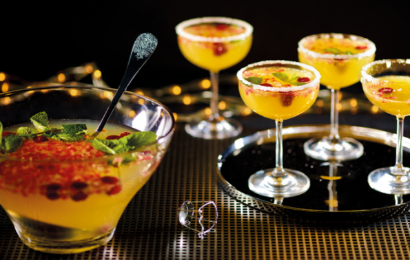 - Afegir-hi les llavors de magrana, els gerds i les fulletes de menta. Remenar-ho molt lleugerament. Omplir les copes amb el còctel i servir-ho.